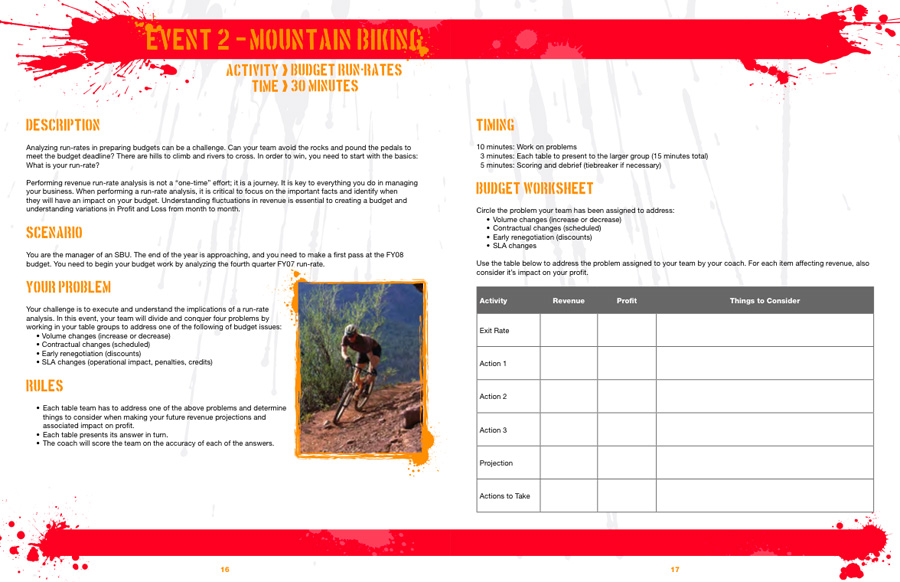 This book was created as a program for a training event for the company's managers, to give info on the events that were scheduled to take place. The event had an X Games theme, and the program was designed to fit with this.